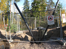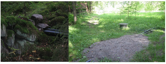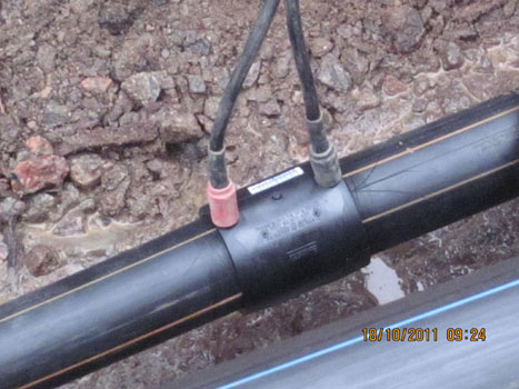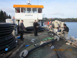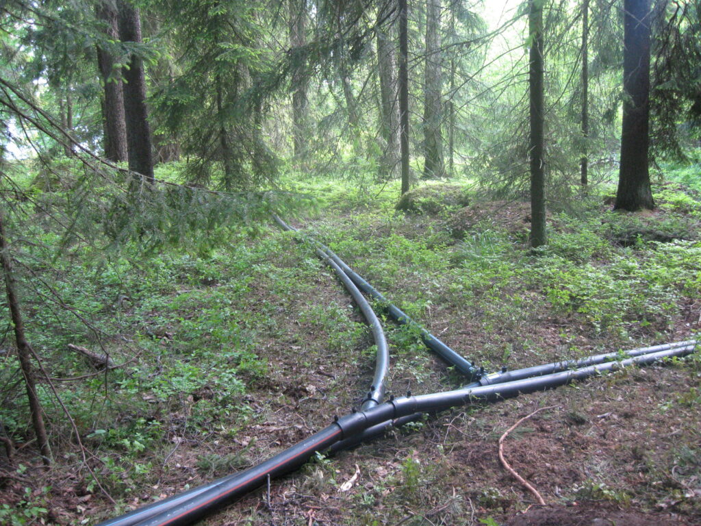 Verkostossa käytetty putkimateriaali on muovi (väri musta). Käyte-tyimmät putkikoot ovat ø 50 – 90 ja paineluokka on 10. Putket maas-tossa erottaa toisistaan putkessa oleva värikoodista. Sininen raita tarkoittaa vesiputkea ja ruskea raita jätevesiputkea. Alla olevassa kuvassa putkien tekeillä oleva sähkömuhviliitos.